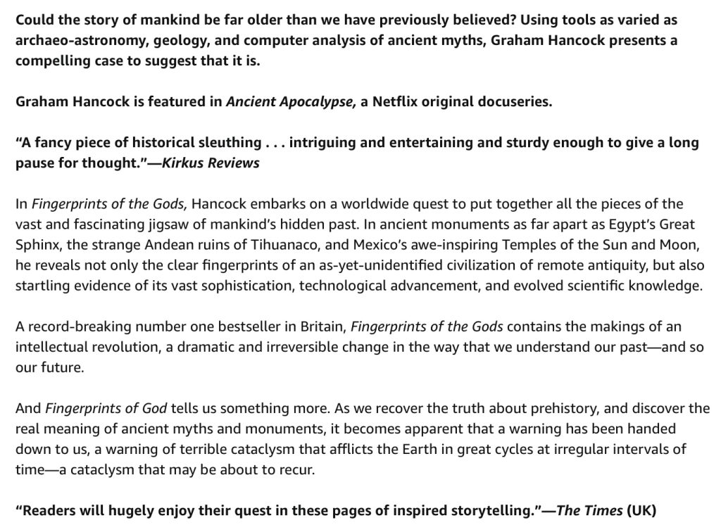 Mr. Hancock has since gone on to write lots of other books in the decades since Fingerprints came out, and some of them are pretty wild, but this one stands as his classic and best selling. If you want to see his Netflix series (I found it slow…) you can do that here.