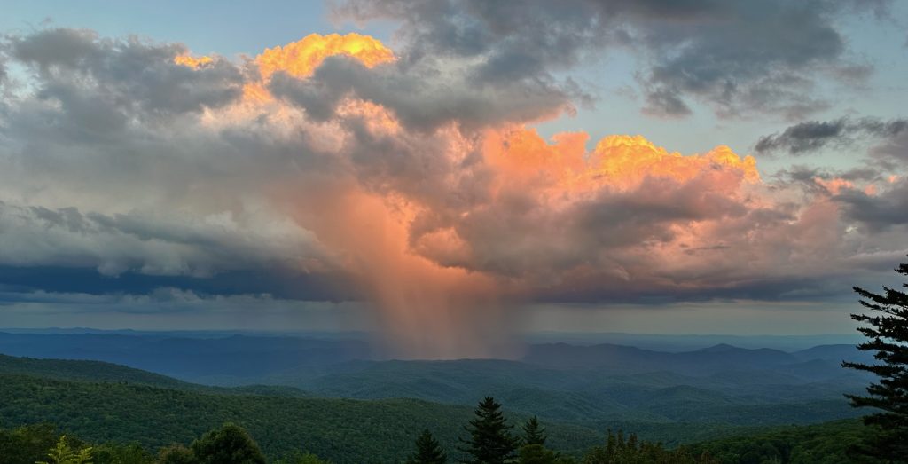 So, I’ll just be here in my little corner of the Blue Ridge, watching the morning “cloud lakes” in the valleys burn off, the evening fire-in-the-sky sunsets, the clear, dark skies full of stars at night, and listening to… the quiet; very, very grateful I’ve had the great privilege to live on both coasts of this magnificent country, spend my sunset years free to roam the in-betweens, then return home to enjoy this magical little mountain corner of it.