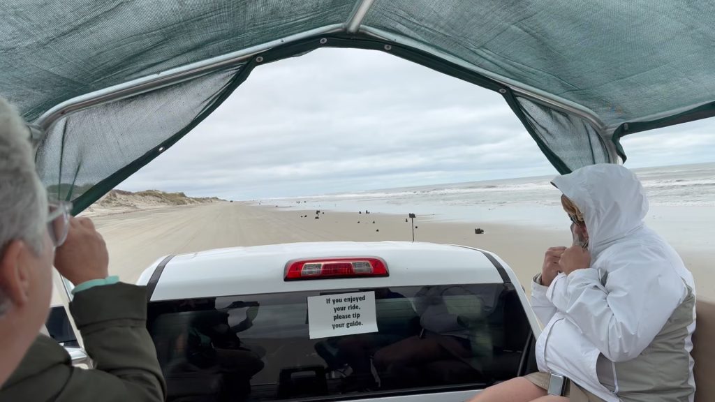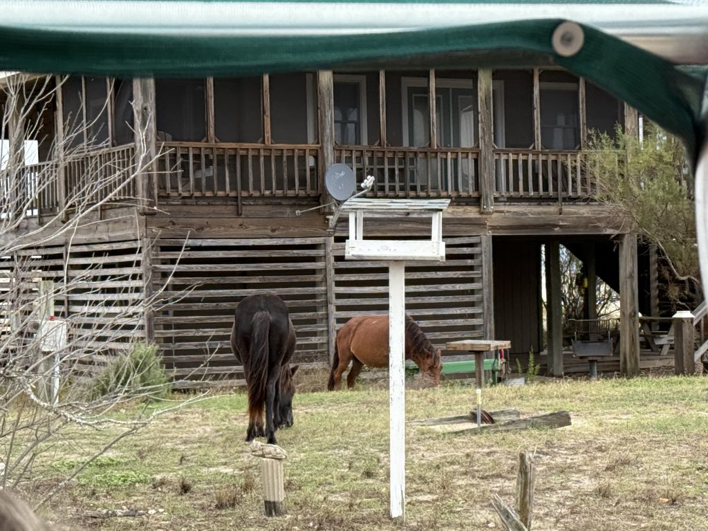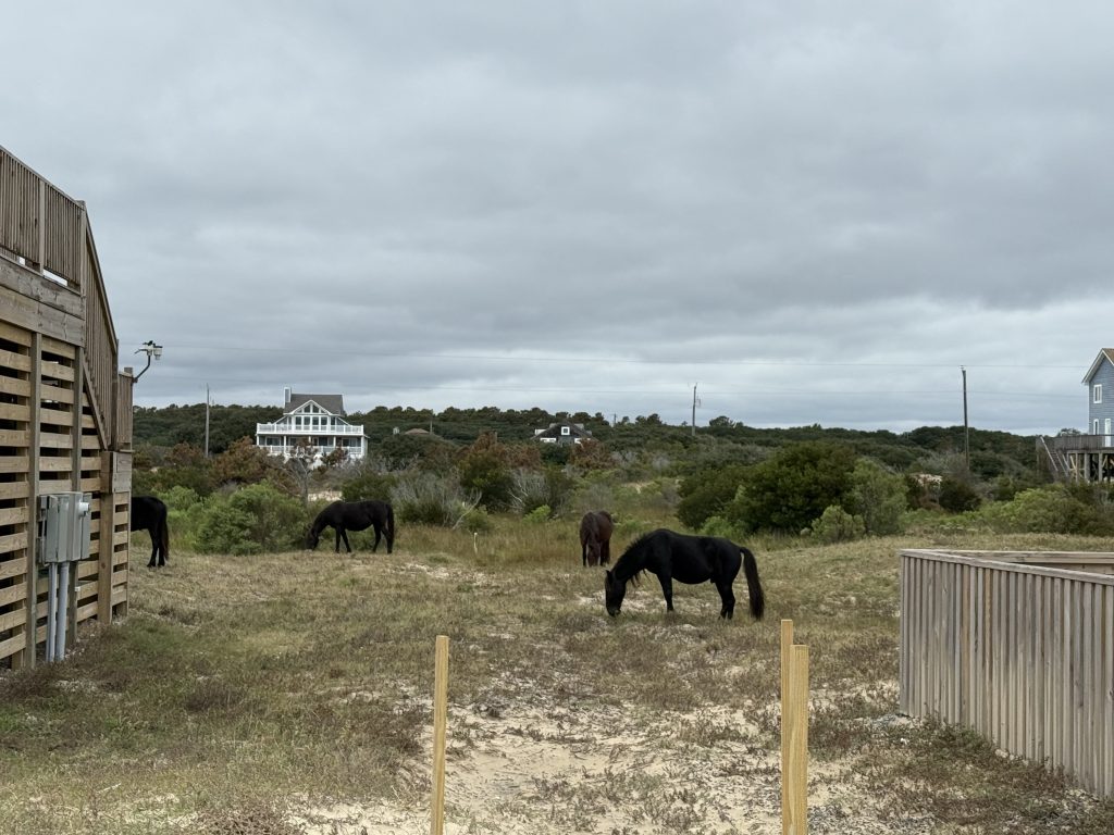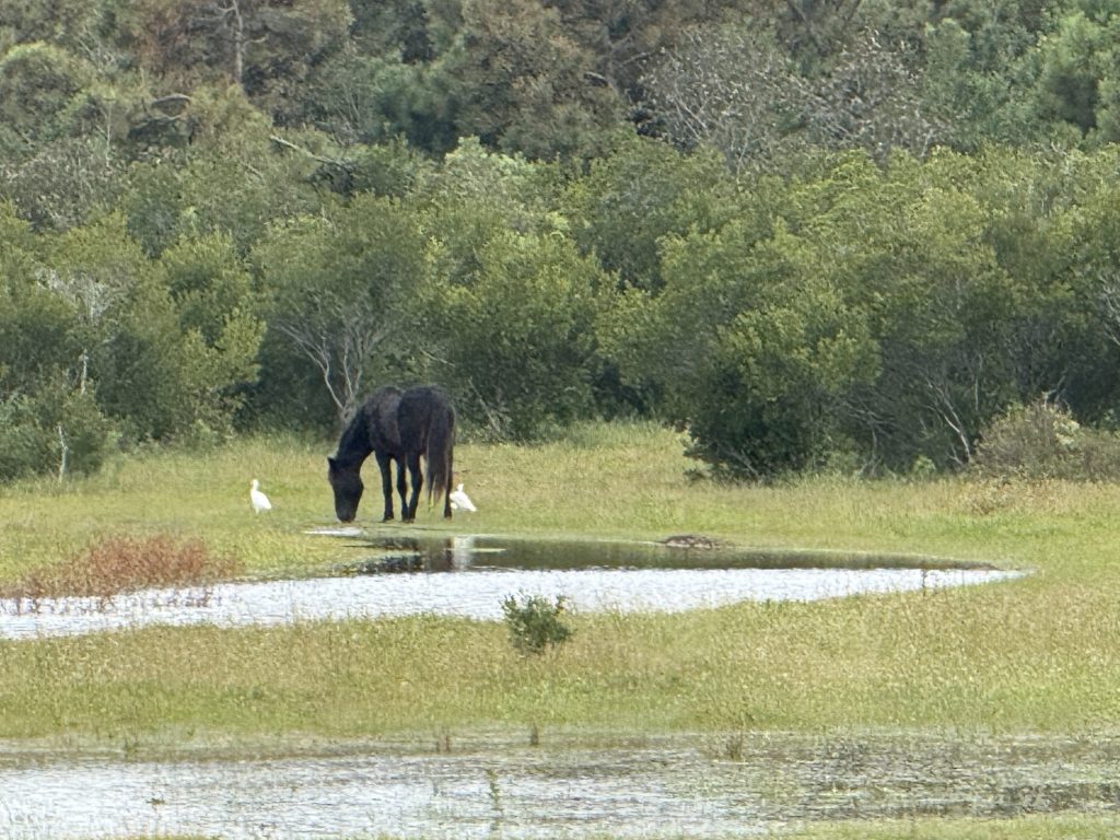 The next day the rain cleared, thank goodness, because we had a tour of the wild horses on Corolla scheduled. The tour vehicle is basically a pick-up truck with benches mounted in the back and our tour guide, a lady about Mike’s age, named Edna, drove. She lived out on the 4×4 beach there so was very accustomed to driving out there and knew all about the horses.