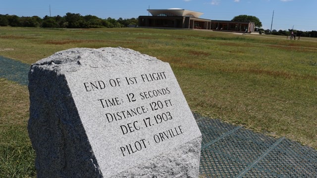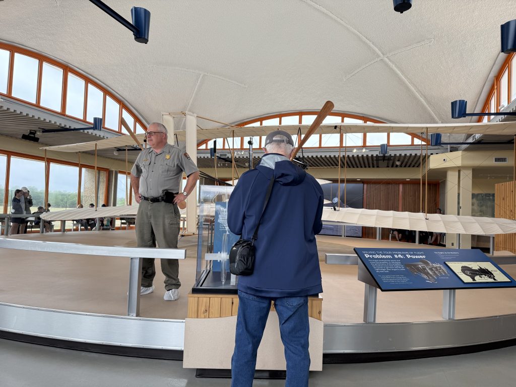 Then we went to the National Park Service’s Wright Brothers Memorial. That was a wonderful time, made most interesting by the park ranger who gave about a half hour talk on the history of the first flight. They made at least four attempts there, and out in the field, they marked each of them with stone markers, each one further than the next, with the fourth being waaaaaaaay far away from the first three. As the ranger said, they’d solved the problem of making a flying machine, but actually knowing how to fly the thing was a separate matter, so it took a few tries. The photo below shows the first marker. In the background is the building where the talk was held, and in there is the exact, full-scale replica of the plane, which you can see in my photo above. Its wings were forty feet wide. The story the ranger told was great; the Wright Brothers’ mother and sister were both highly educated women (rare for the time) and were instrumental in their success.