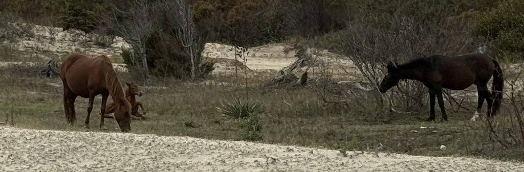 Those “chunks” on the beach are what’s left of a forest. There used to be forest land where there is now beach. The horses were actually up off to the left. Edna would drive off the beach and into the dunes where there was dune grass, and where there is dune grass, there are horses!