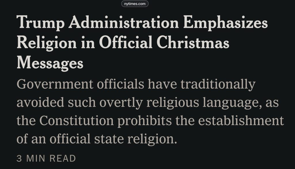 It’s so easily knocked down. It’s tedious to even say it. Do I have to? Ok: Observing one’s religion is not establishment! I’ve seen the videos they’re referring to. They’re all over X. They’re perfectly harmless, anodyne Christmas videos. FFS.
